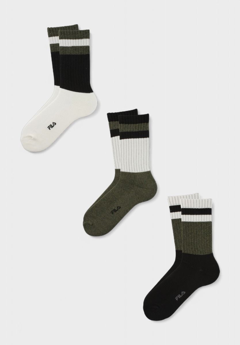 Το σετ περιλαμβάνει τρεις αποχρώσεις (μαύρο, χακί και λευκό) με ριγέ λεπτομέρειες και διακριτικό λογότυπο Fila, ιδανικές για καθημερινή χρήση, το γραφείο ή το γυμναστήριο.