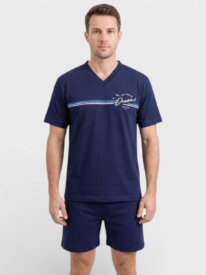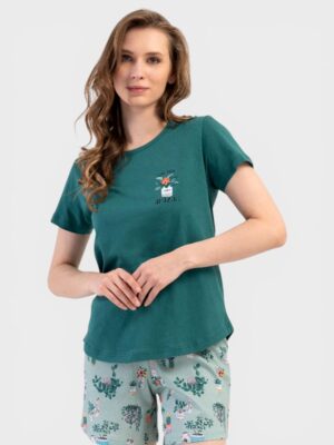 Το σετ αποτελείται από κοντομάνικη μπλούζα με μοντέρνο τύπωμα στο στήθος και άνετο σορτσάκι, δημιουργώντας έναν casual και ευχάριστο συνδυασμό για στιγμές χαλάρωσης στο σπίτι.