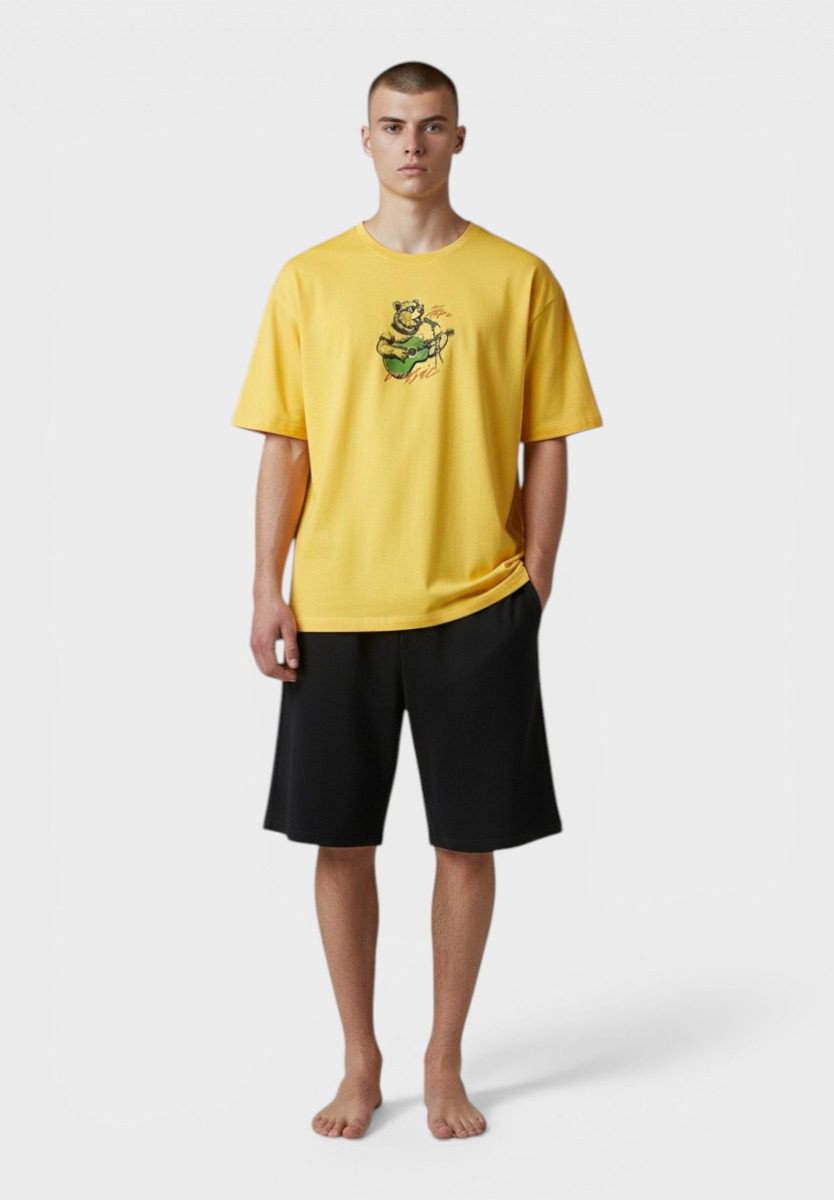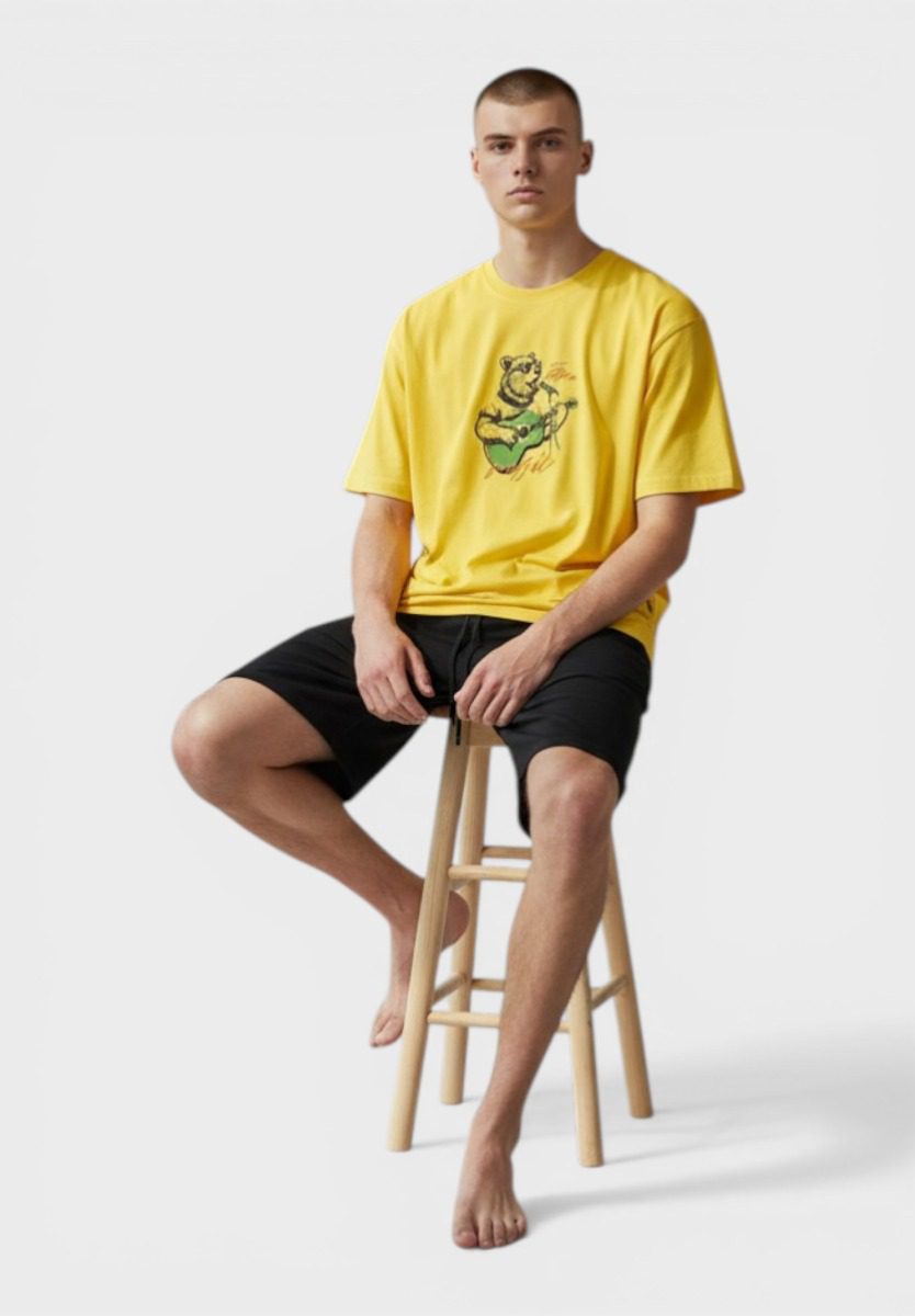 Ανδρική καλοκαιρινή πιτζάμα Vienetta σε ζωηρή κίτρινη απόχρωση, ιδανική για άνεση και στυλ μέσα στο σπίτι. Το σετ αποτελείται από κοντομάνικη μπλούζα με διακριτικό print και μονόχρωμο σορτσάκι σε μαύρο χρώμα, δημιουργώντας έναν μοντέρνο και ευκολοφόρετο συνδυασμό.