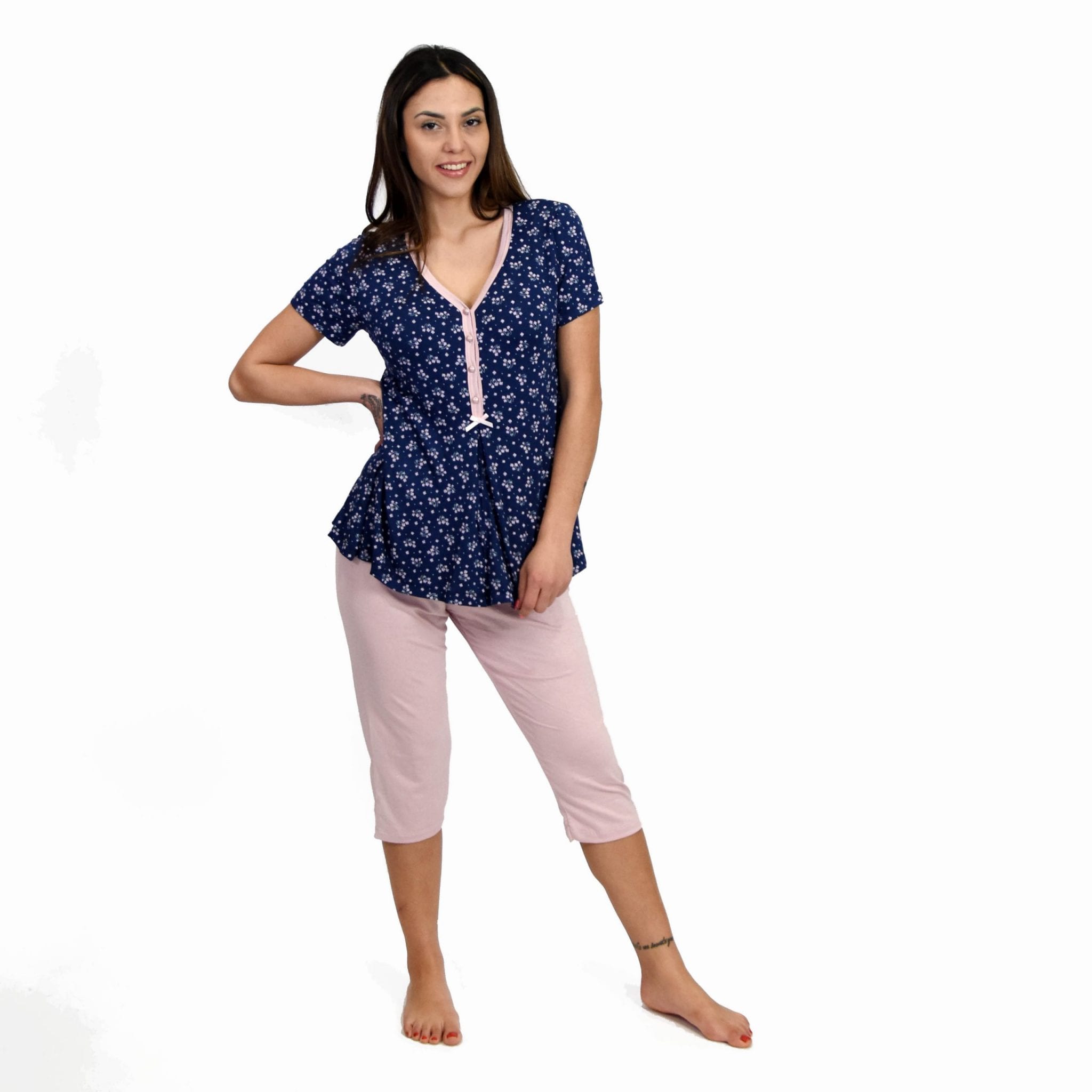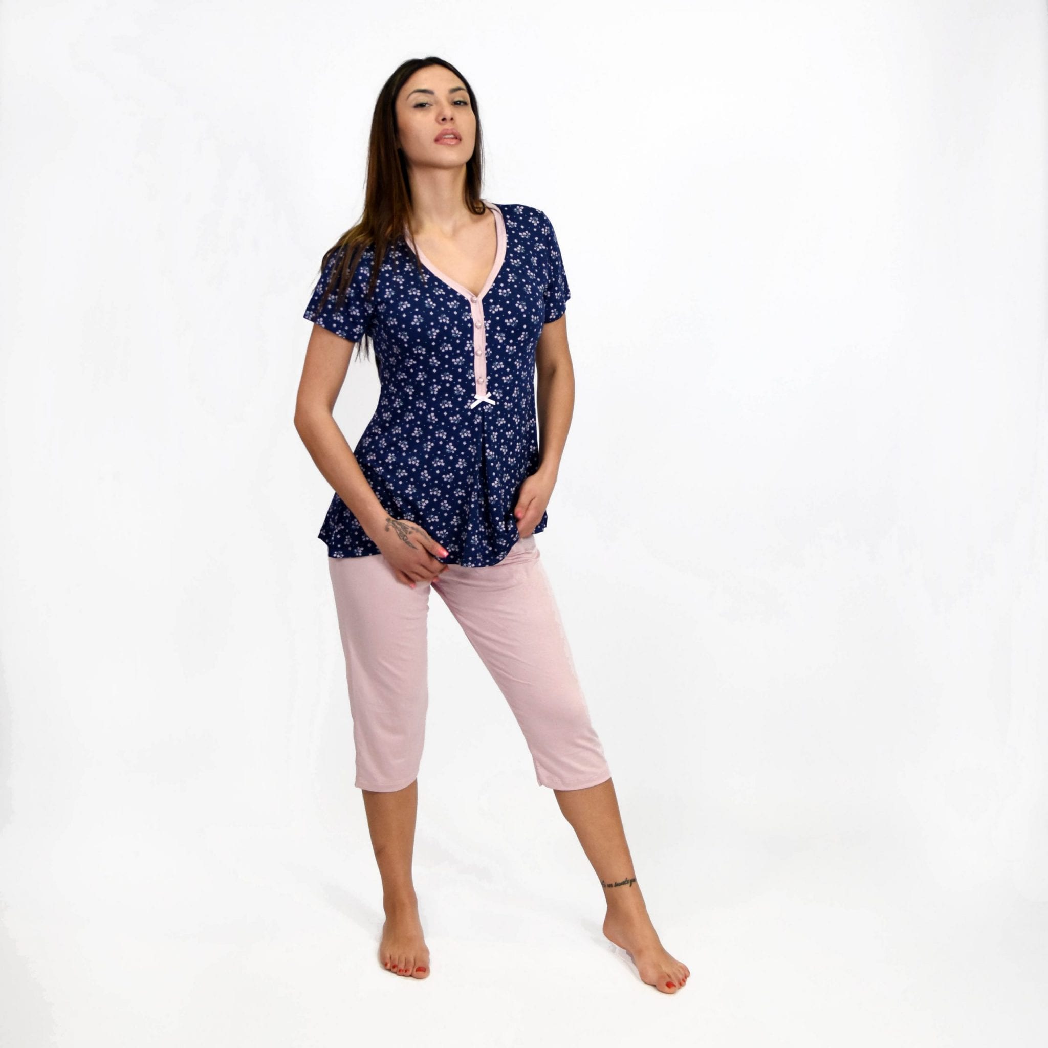 Το σχέδιο της γυναικείας καλοκαιρινής πυτζάμα σετ κοντομάνικη με κάπρι παντελόνι σε υπέροχο συνδυασμό χρωμάτων είναι τέτοιο ώστε να είναι ιδανική για όλες τις γυναίκες, οποιασδήποτε ηλικίας και σωματότυπου. Αρκεί να θέλουν να νοιώθουν άνετα, και μια νότα ρομαντισμού και στον ύπνο τους.