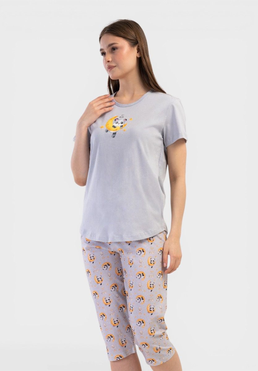 Γυναικεία καλοκαιρινή πιτζάμα κάπρι Vienetta σε απαλή γκρι απόχρωση, με χαριτωμένο panda print που προσθέτει παιχνιδιάρικη διάθεση στο σύνολο. Το σετ περιλαμβάνει κοντομάνικη μπλούζα με minimal σχέδιο και κάπρι παντελόνι με all-over print, δημιουργώντας ένα άνετο και νεανικό look.
