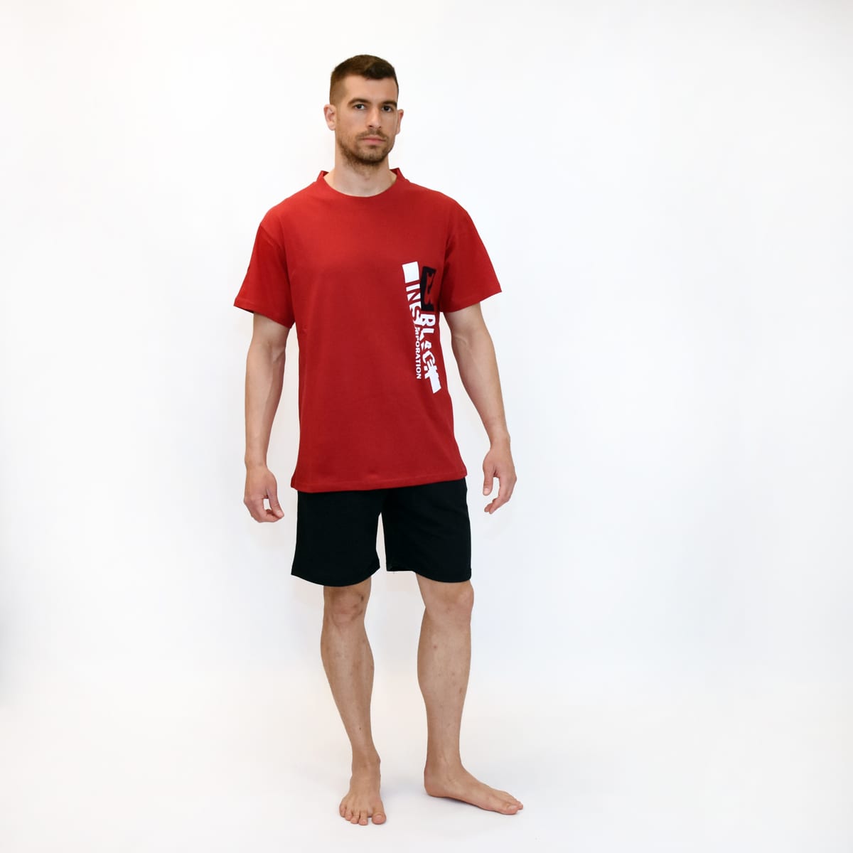Θα λατρέψετε, όπως κι εμείς, την Ανδρική Καλοκαιρινή Πυτζάμα  με Κοντό Παντελόνι και Τσέπες. Το μπλουζάκι με το κοντό παντελόνι δημιουργούν ένα ιδανικό σετ για άνετο, δροσερό ύπνο. Το κόκκινο με εκτύπωση στο αριστερό στήθος μπλουζάκι, σε στυλ Τ-shirt είναι σε φαρδιά γραμμή με κοντά μανίκια και μήκος κάτω από τη μέση. Το μαύρο κοντό παντελόνι , φτάνει λίγο πάνω από το γόνατο, έχει πλαϊνές τσέπες και λάστιχο στη μέση. Όλα αυτά  κάνουν την Ανδρική Καλοκαιρινή Πυτζάμα  με Κοντό Παντελόνι και Τσέπες άνετη, ευκολοφόρετη είτε μαζί είτε χωριστά το κάθε μέρος του σετ.