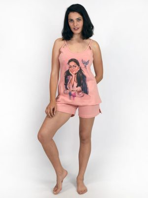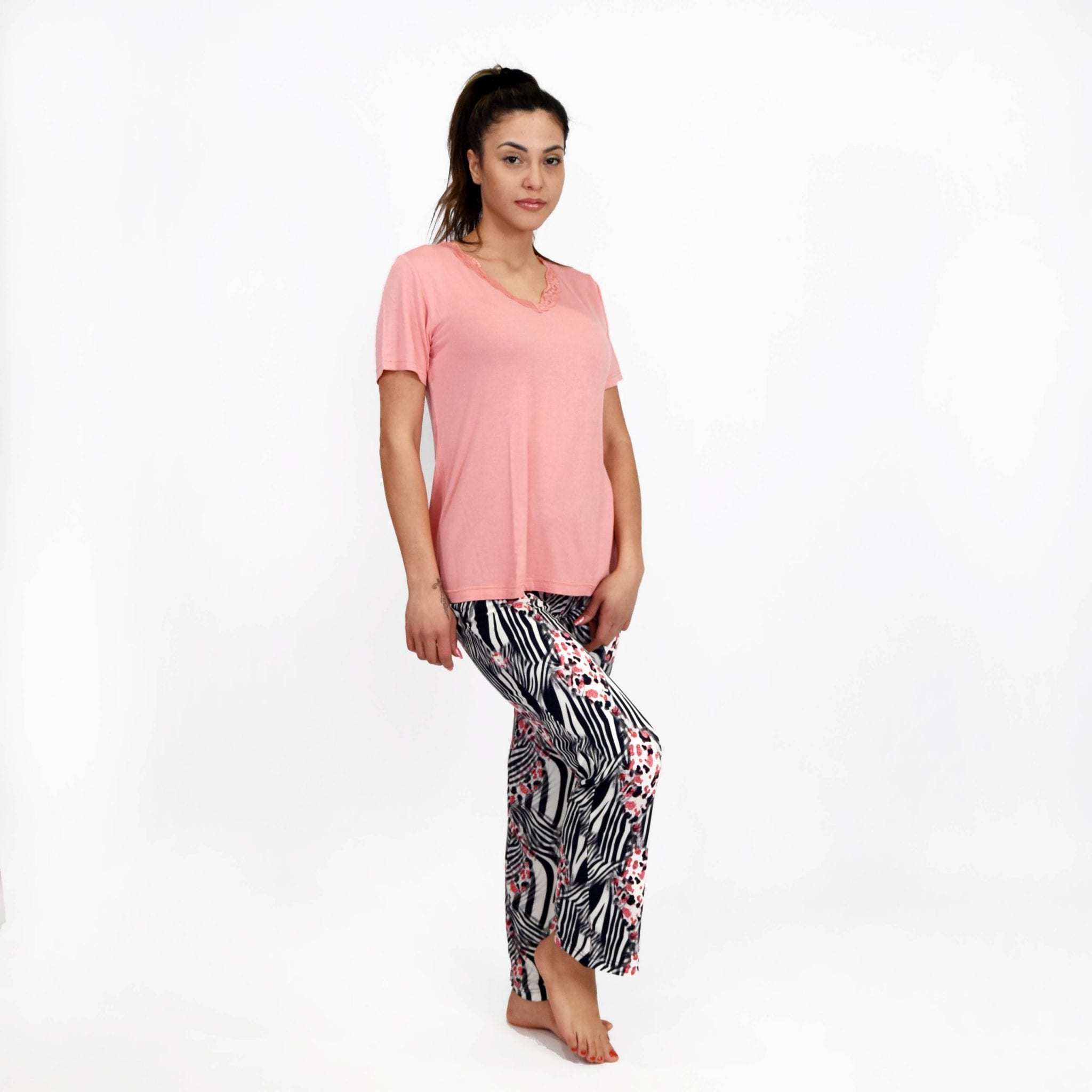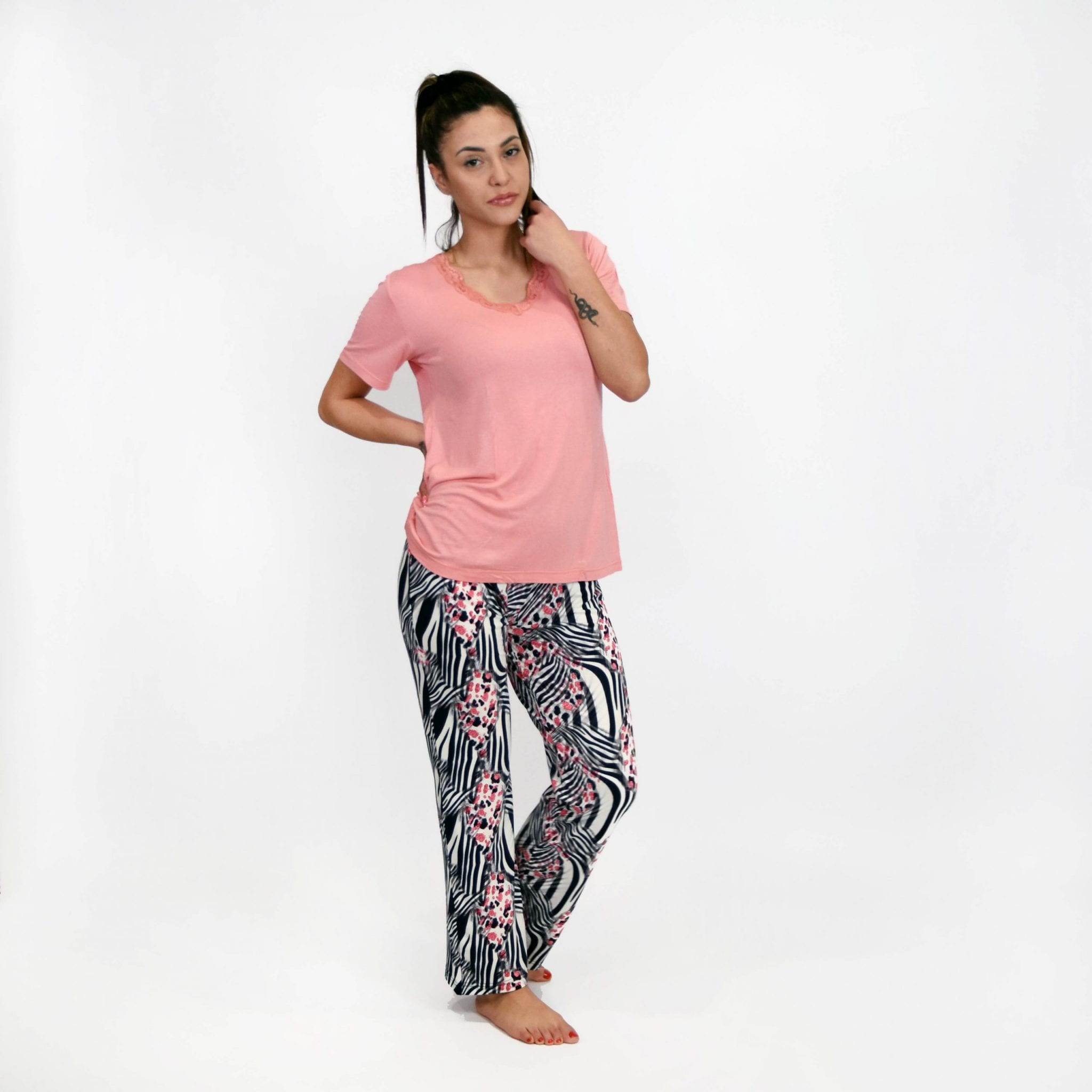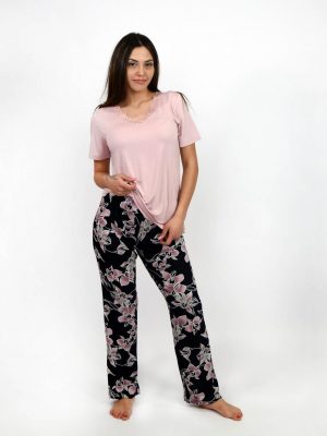 Η γυναικεία καλοκαιρινή πυτζάμα σετ κοντομάνικη με μακρύ εμπριμέ παντελόνι με τις αντιθέσεις των ροζ-άσπρο-μαύρο, σας υπόσχεται έναν δροσερό, χαλαρωτικό ύπνο. Η κοντομάνικη μπλούζα σε στυλ T-shirt και χρώμα κοραλλί,  έχει λαιμόκοψη σε σχήμα V διακοσμημένη με φαρδιά δαντέλα, χαρακτηριστικά που της προσδίδουν άνεση και ένα αίσθημα πολυτέλειας. Στο κάτω μέρος το μακρύ εμπριμέ παντελόνι   αγκαλιάζει κομψά το σώμα. Η ελαστική ζώνη επιτρέπει να κινείστε με άνεση.