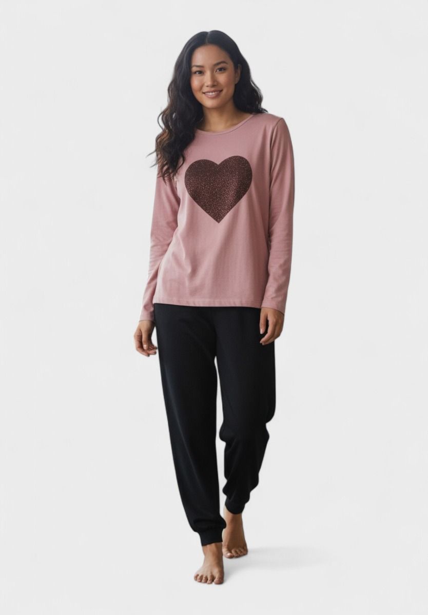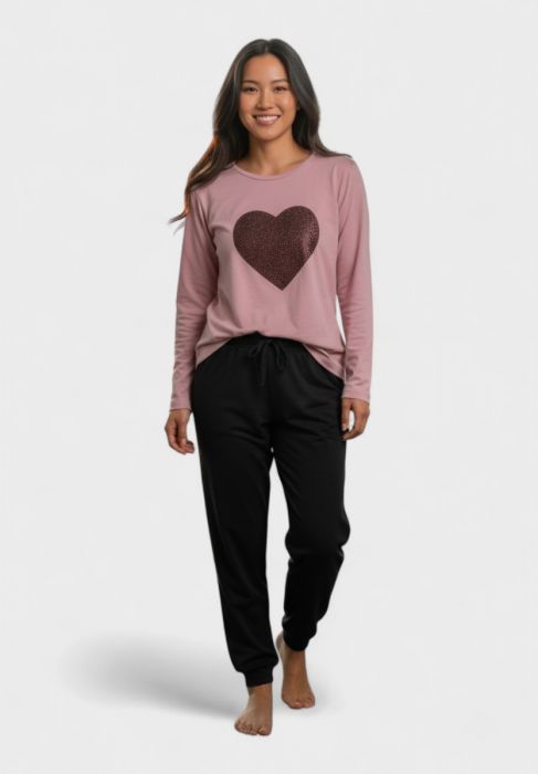 Το σετ αποτελείται από μακρυμάνικη μπλούζα σε απαλό ροζ χρώμα με εντυπωσιακή στάμπα σε σχήμα καρδιάς με glitter εφέ, που χαρίζει θηλυκότητα και παιχνιδιάρικη διάθεση. Το μαύρο παντελόνι διαθέτει λάστιχο στη μέση και στα μπατζάκια, εξασφαλίζοντας σταθερή εφαρμογή και πρακτικότητα.