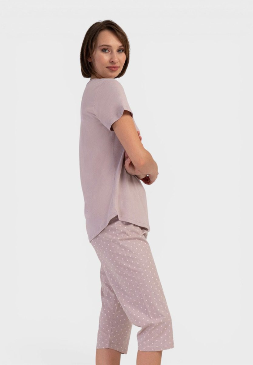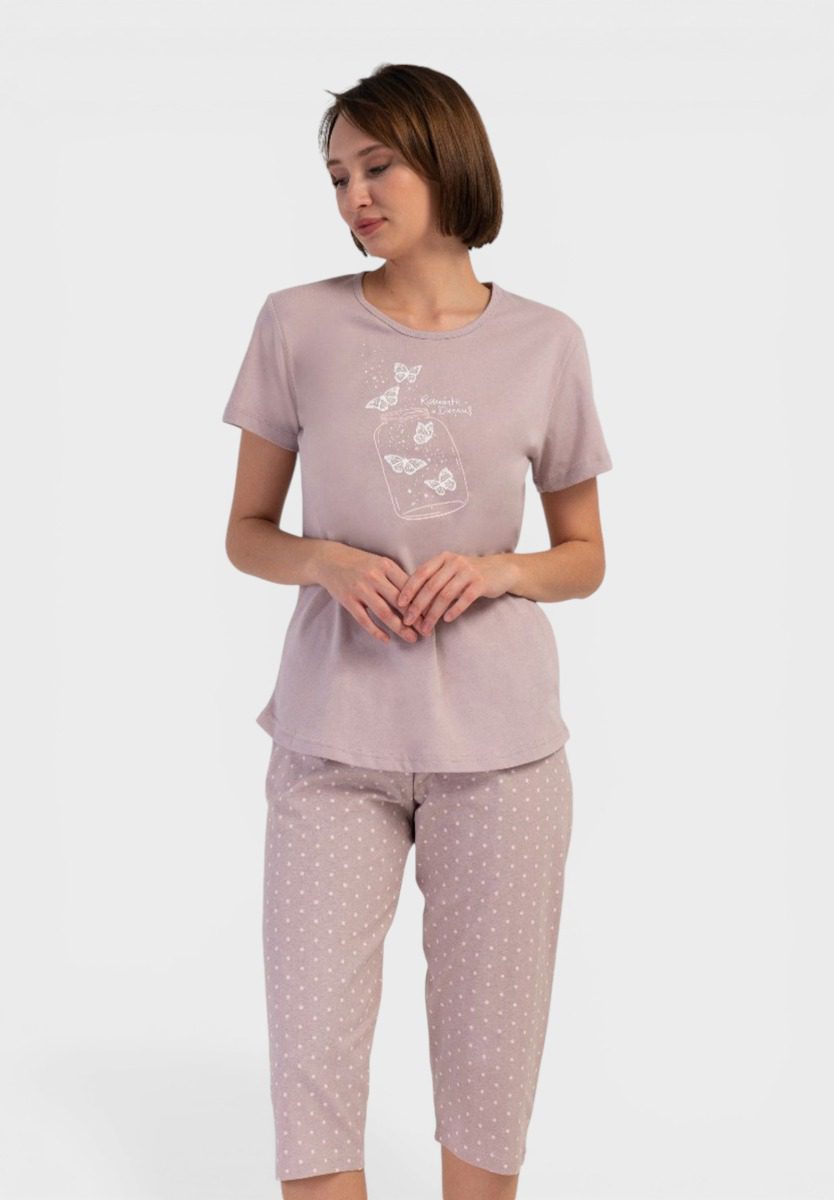 Γυναικεία καλοκαιρινή πιτζάμα κάπρι Vienetta σε απαλό ροζ/nude τόνο, που συνδυάζει κομψότητα και άνεση. Το σετ αποτελείται από κοντομάνικη μπλούζα με διακριτικό print και κάπρι παντελόνι με μικροσχέδιο, δημιουργώντας ένα minimal και θηλυκό σύνολο.