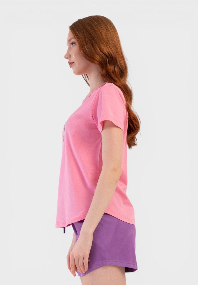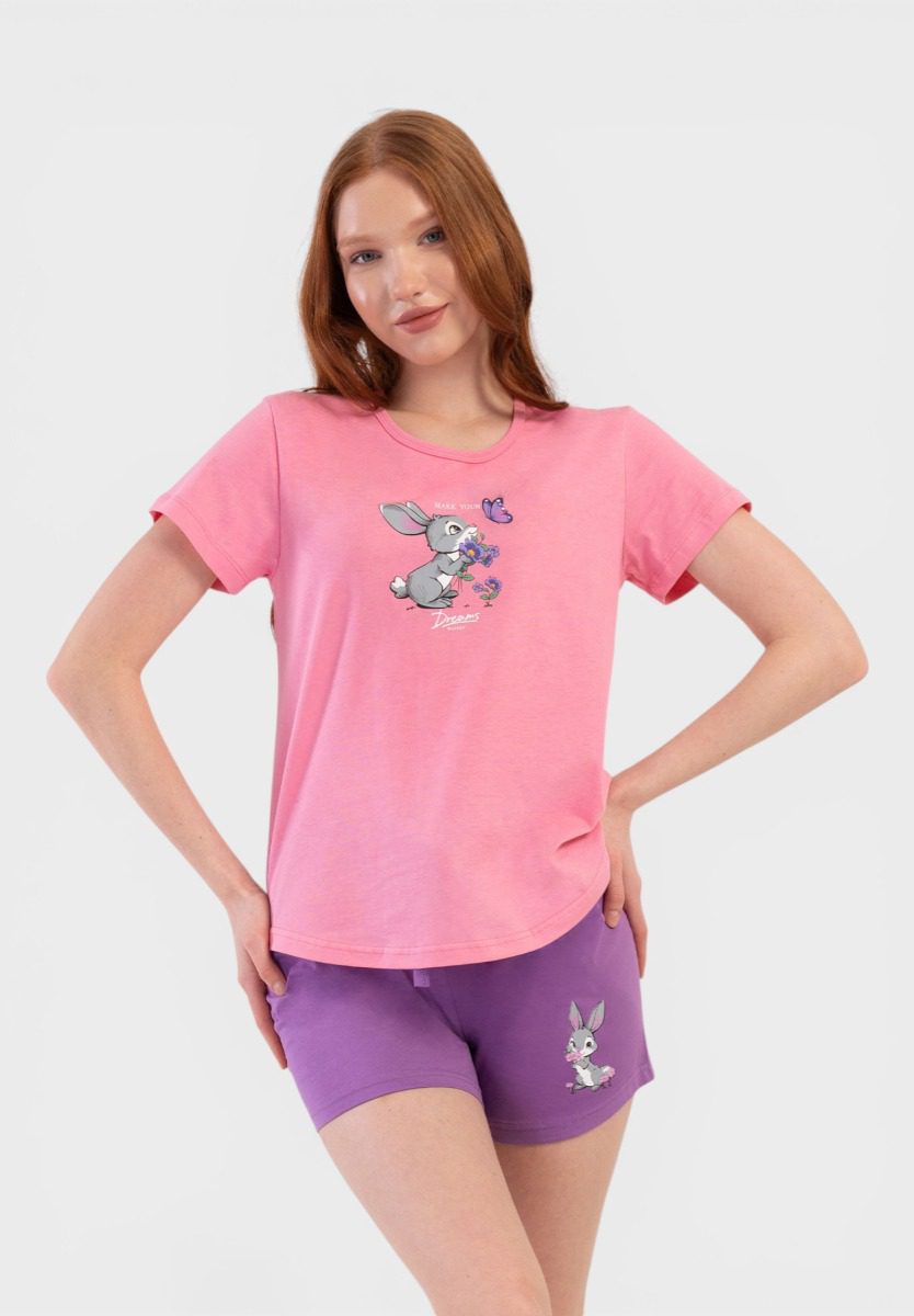 Γυναικεία καλοκαιρινή πιτζάμα Vienetta σε φωτεινή ροζ απόχρωση με χαριτωμένο bunny print που προσθέτει παιχνιδιάρικη και νεανική διάθεση. Το σετ αποτελείται από κοντομάνικη μπλούζα με σχέδιο στο στήθος και σορτσάκι σε μωβ χρώμα με αντίστοιχο print.